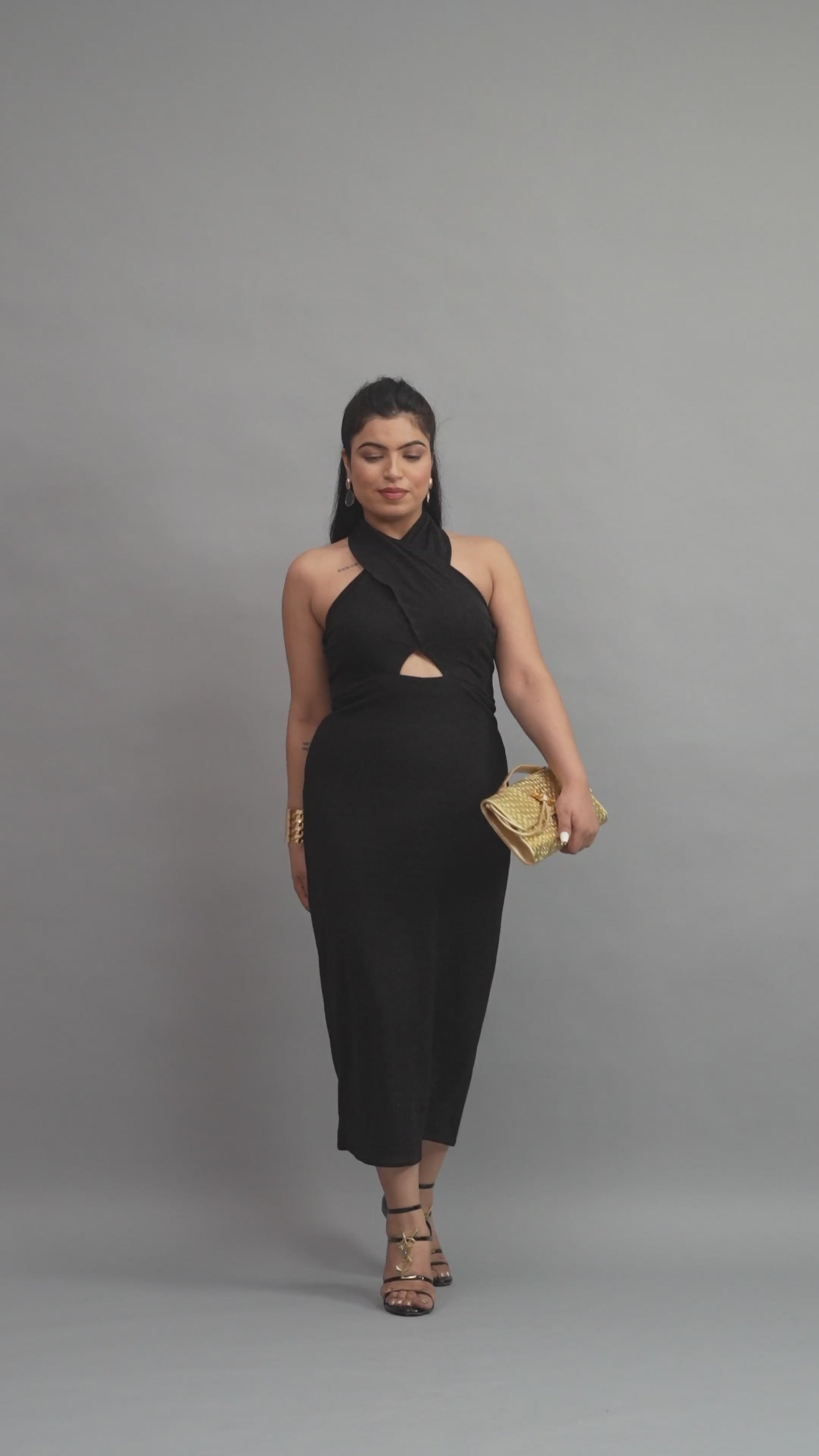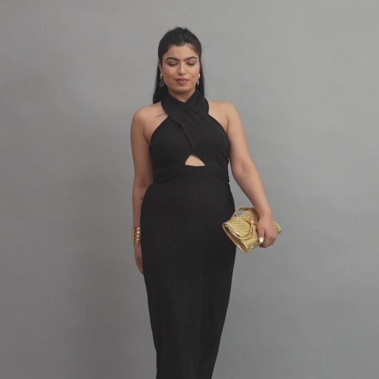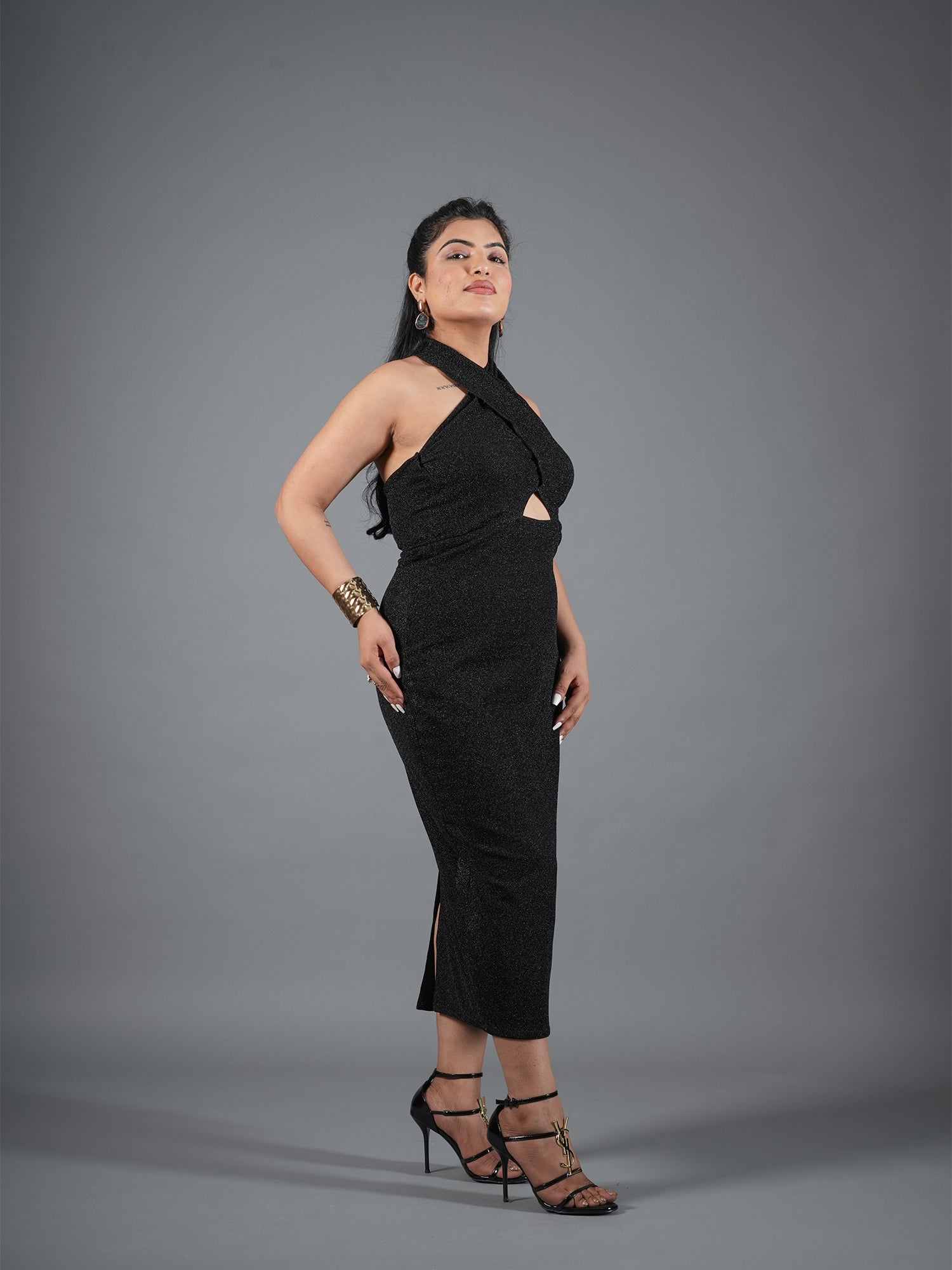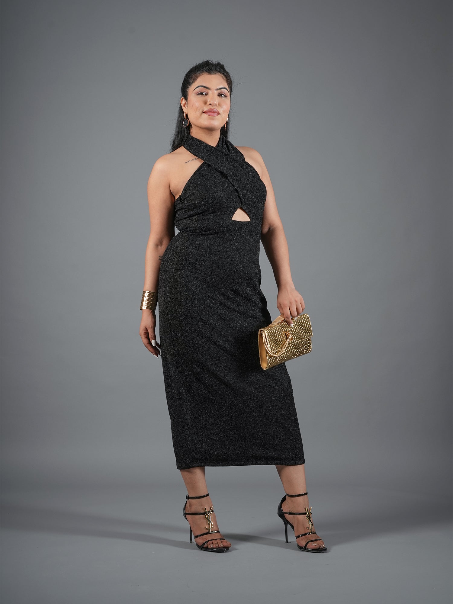 Midnight Shimmer Halter Cut-Out Midi Dress
