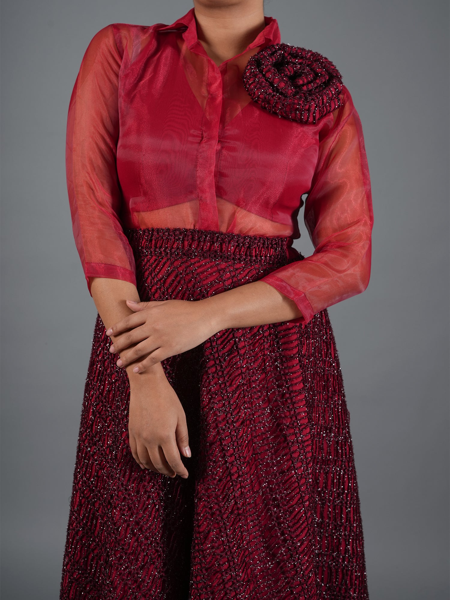 Make a grand entrance with our Crimson Luxe Set, a masterpiece of texture and bold color. This two-piece ensemble features a delicate sheer organza button-down shirt, elevated by a handcrafted oversized 3D rosette on the shoulder. Paired with a high-waisted, shimmering sequin midi skirt in a rich wine-red tone, this set offers a perfect balance of ethereal softness and high-octane glamour for festive evenings or red-carpet events.