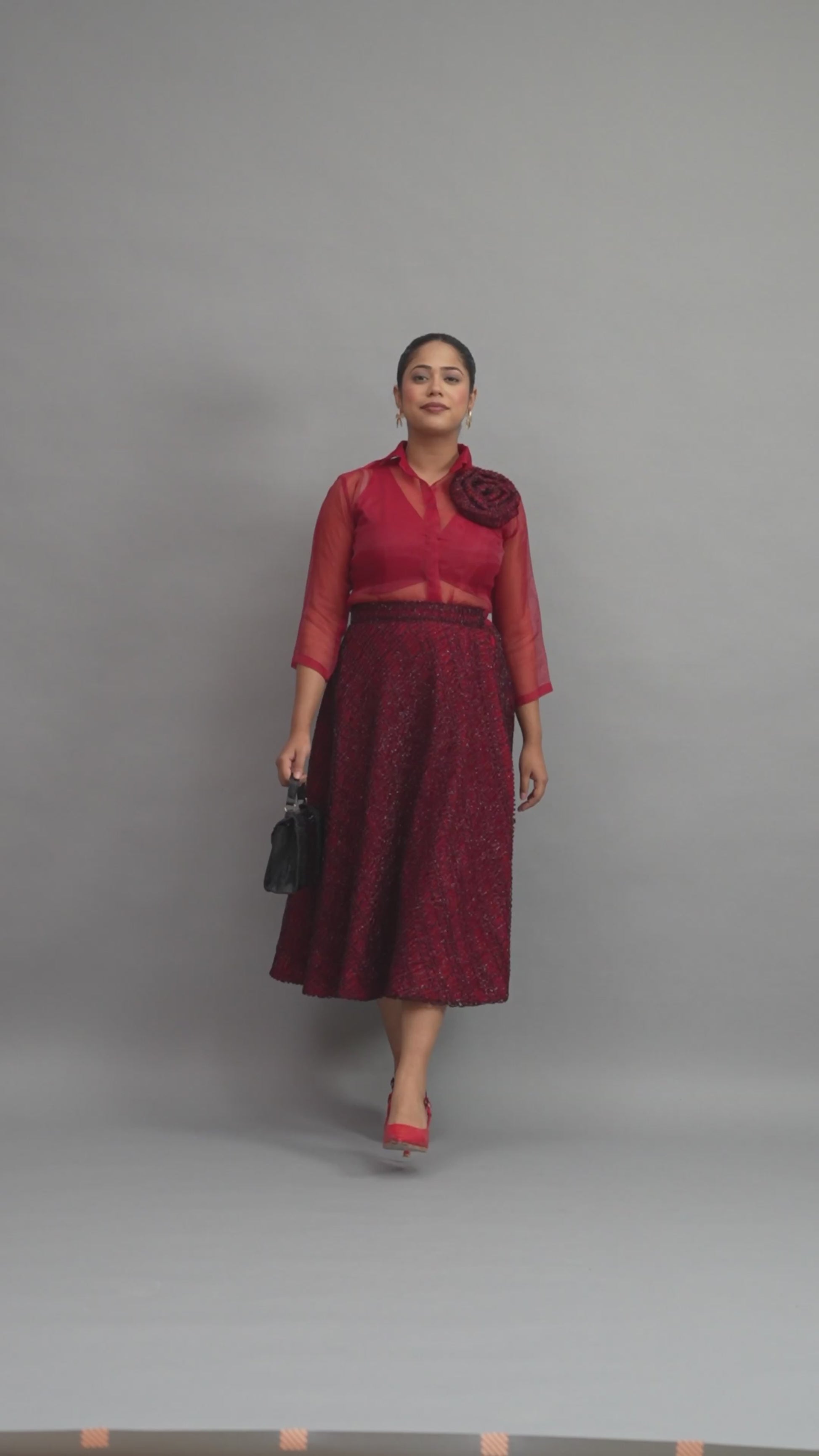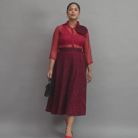 Crimson Sheer Organza Shirt & Sequin Midi Skirt Set