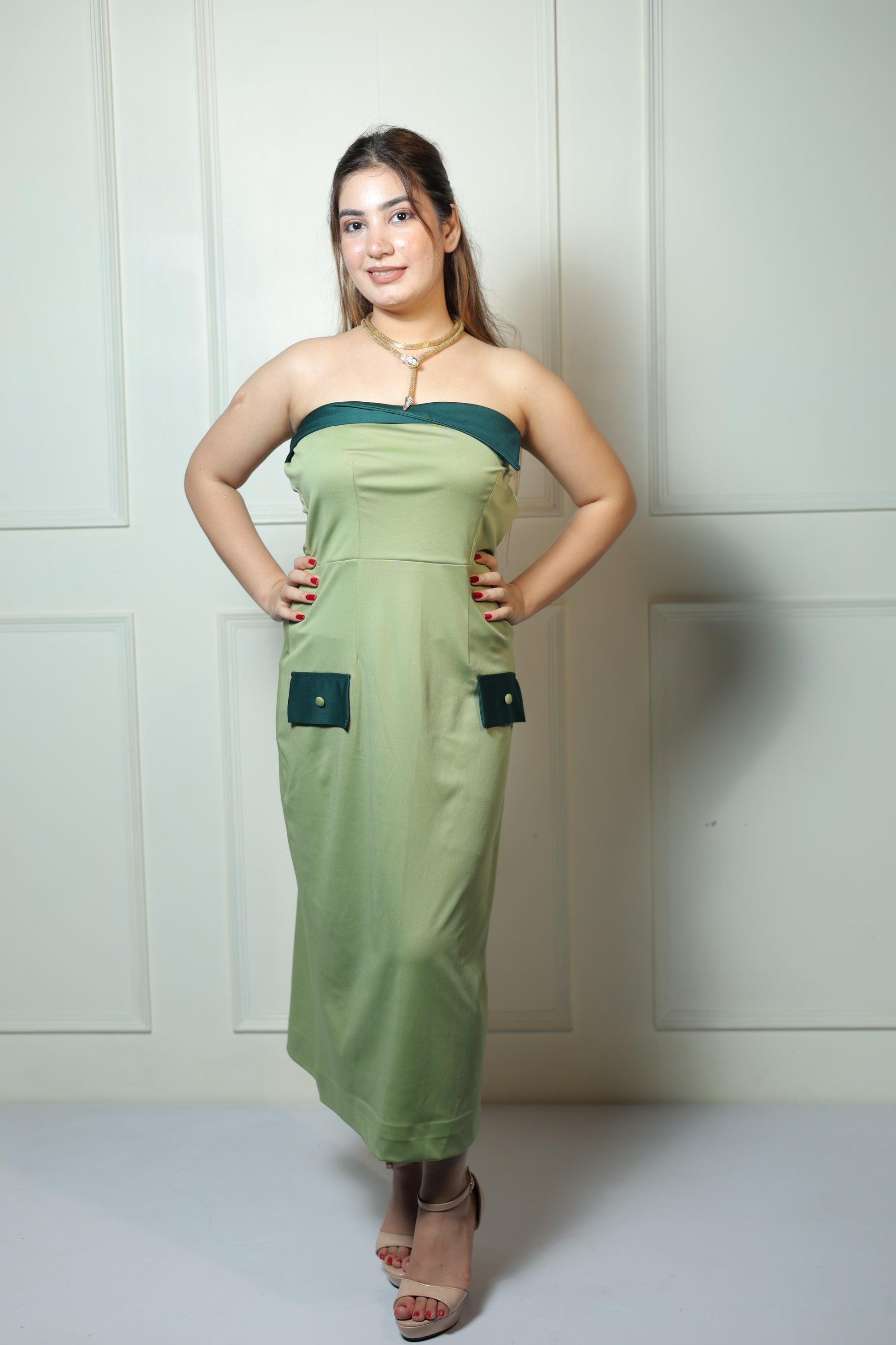 Elevate your wardrobe with our stunning Green Tube Dress, designed to make a statement at any occasion. Featuring a chic reverse collar and stylish fake pocket detailing, this dress combines elegance with modern flair. Its flattering silhouette hugs your curves in all the right places, ensuring you feel confident and poised. Perfect for a night out or a special event, this versatile piece is a must-have addition to your collection. Embrace sophistication and style with this eye-catching dress that promises to turn heads.