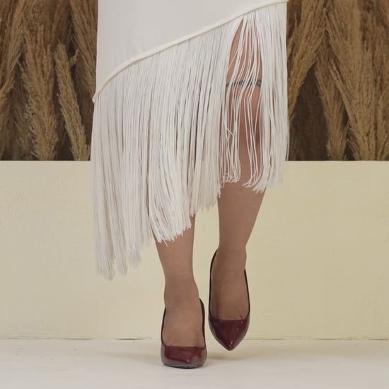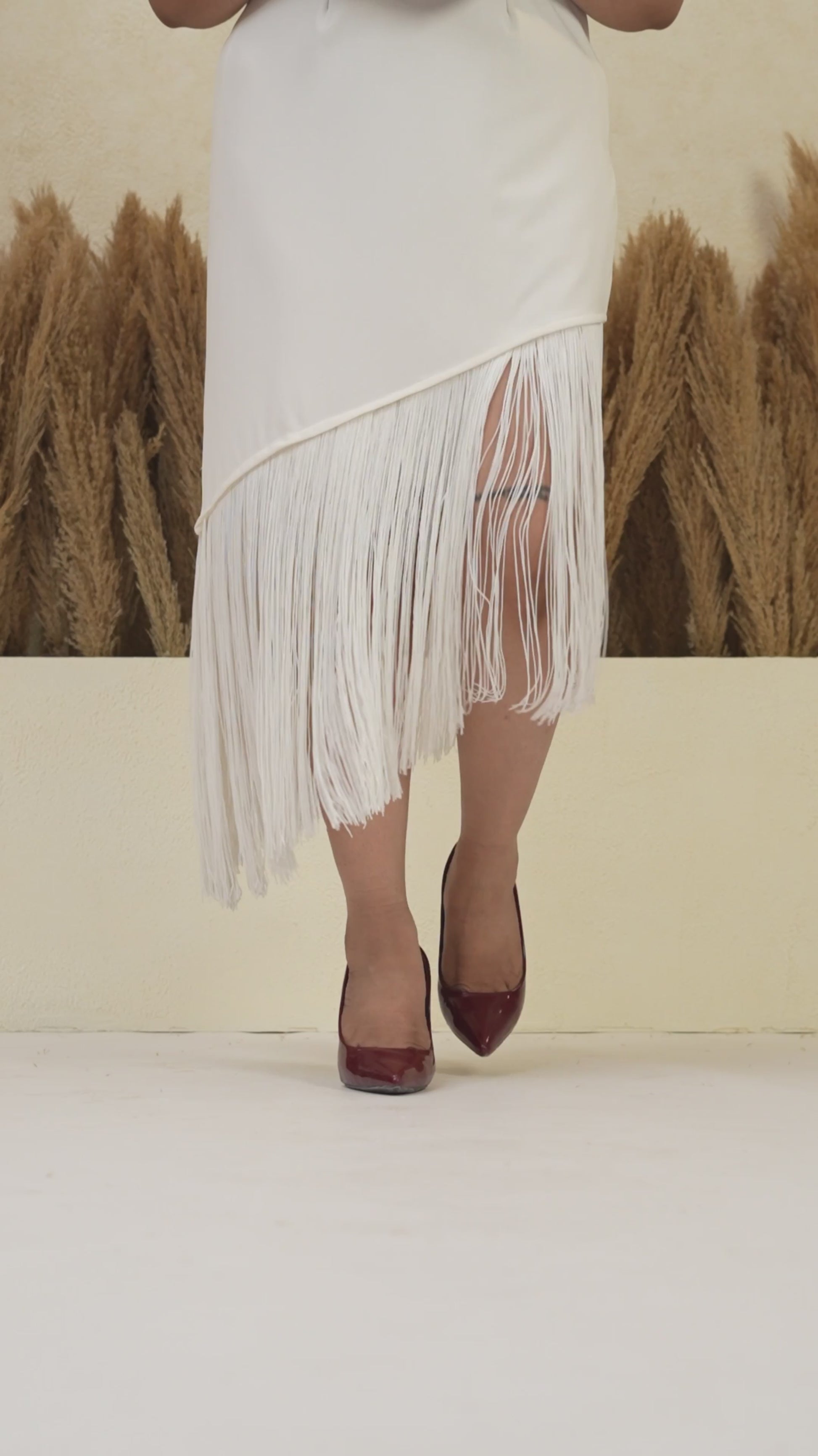 • Dynamic Fringe Hemline: Features long, silky asymmetric fringe that adds fluid motion and a playful, retro-modern edge.