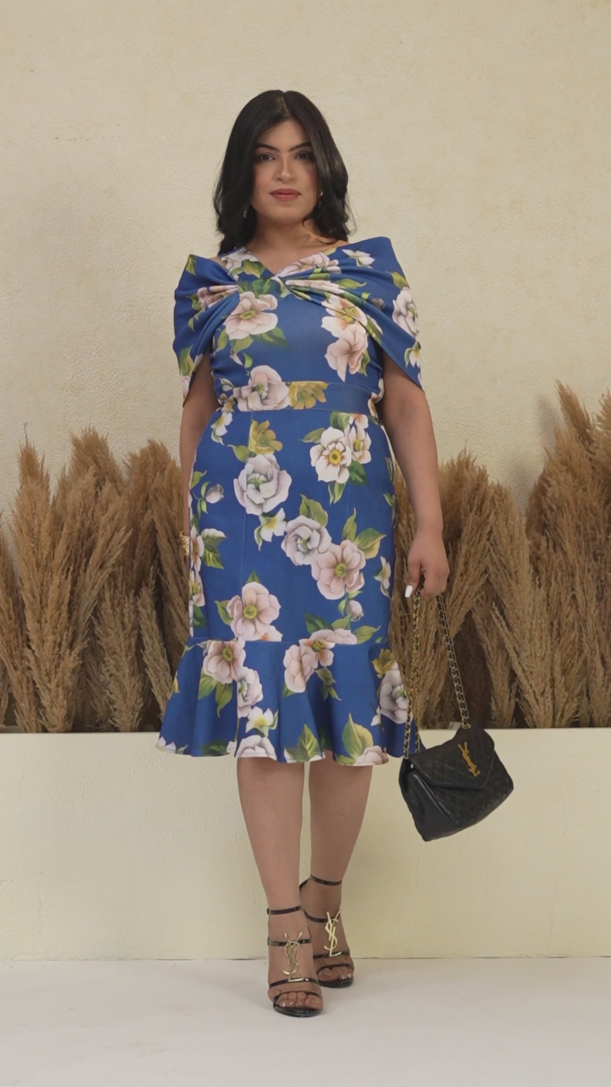 Command the room in this stunning royal blue midi dress featuring a lush, oversized floral print. Designed with a contemporary cold-shoulder neckline and a feminine fishtail ruffle hem, this dress blends high-impact graphics with a perfectly tailored silhouette for your next celebratory event.