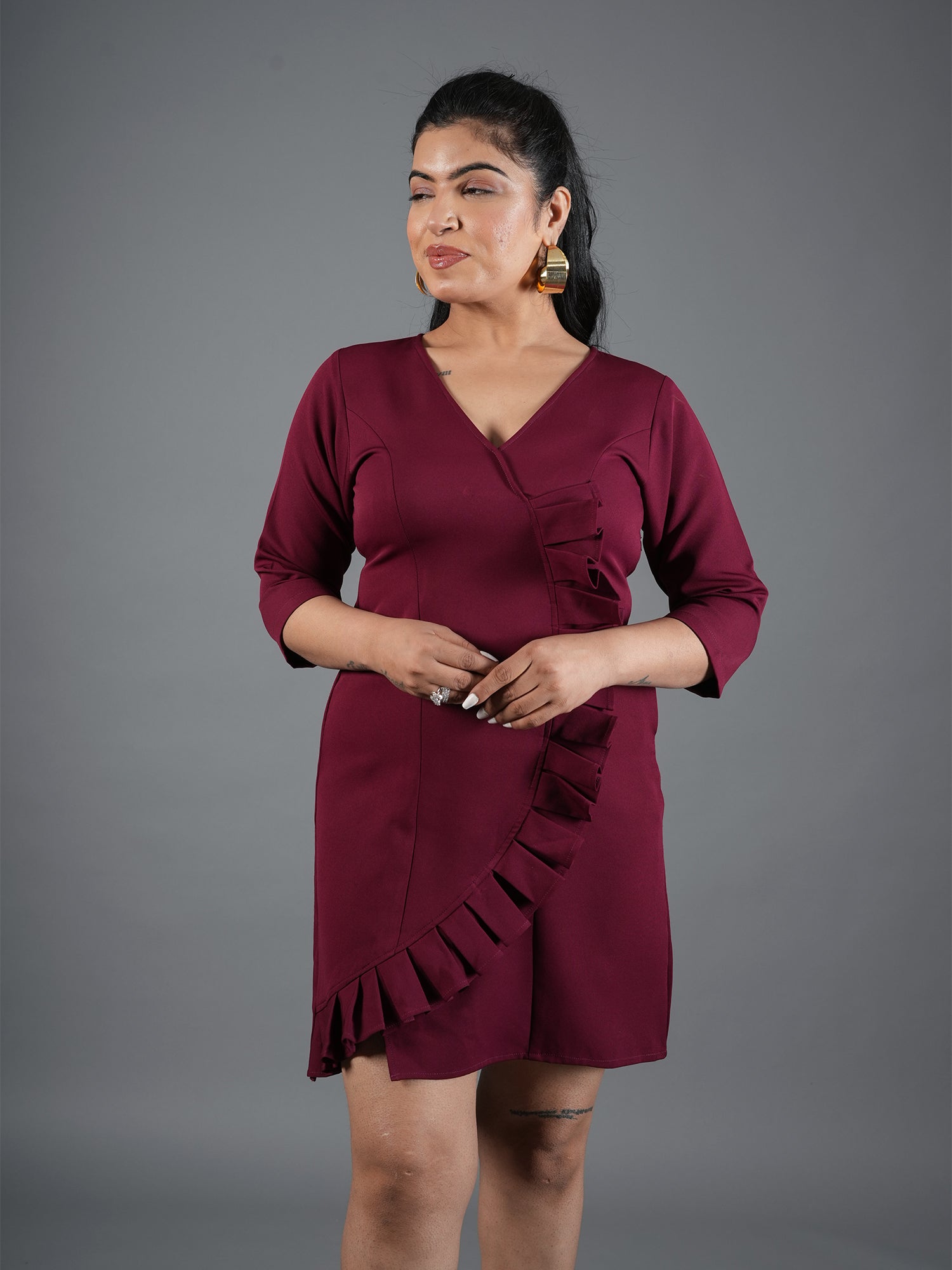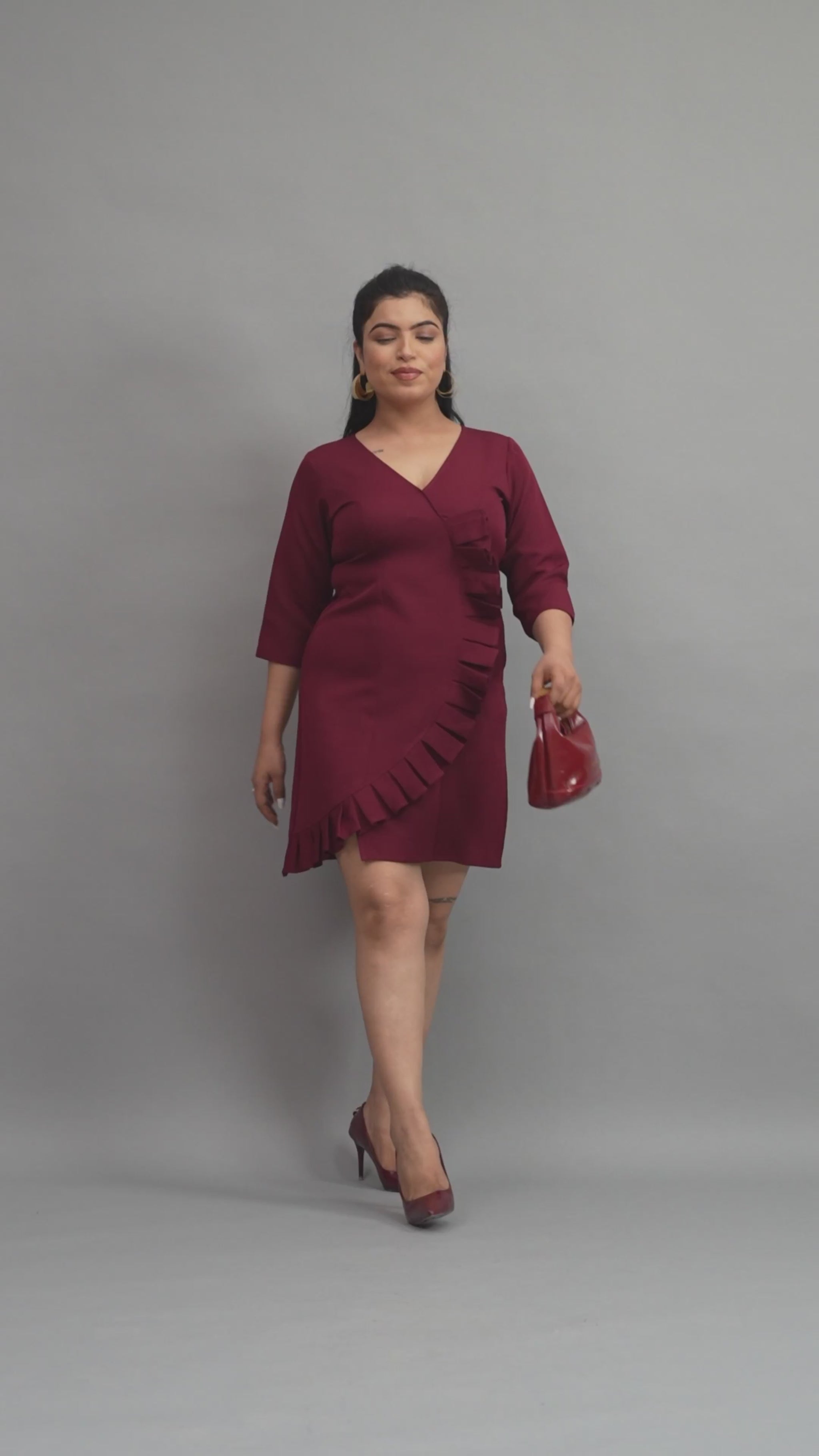 Exude effortless grace in our Merlot Wine Mini. This sophisticated dress features a classic V-neckline and a modern wrap-style front, beautifully elevated by a cascading side ruffle that adds dimension and texture. With its three-quarter sleeves and flattering A-line silhouette, this deep mehroon-colored piece is the perfect transition from professional power-dressing to evening elegance.